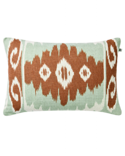 Laya is a 40 x 60 cm linen cushion cover featuring a hand-printed ikat pattern in aqua and apricot orange. Decorative and expressive, it lifts the room with a sophisticated bohemian feel. Plain back. Inner cushion not included.